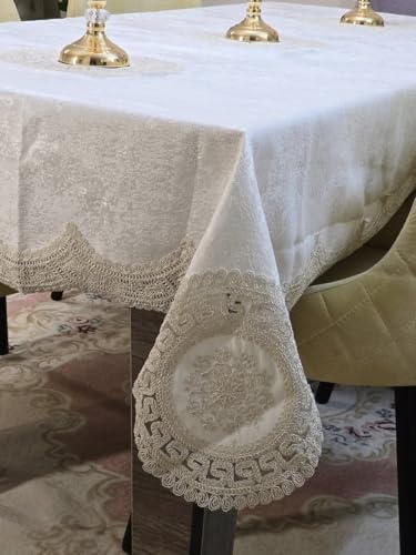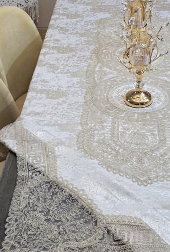 Generic - جيني مفرش طاولة من قماش الجاكار مع تطريز بخياطة متقاطعة، ابيض، 250 × 160 سم، كتان طاولة مزخرف انيق