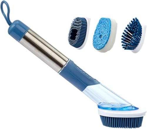 Generic - فرشاة أطباق للمطبخ مع موزع صابون بمقبض من الفولاذ المقاوم للصدأ ب3 رؤوس بديلة وخزان بزر ضغط لتنظيف طاسات القلي والأطباق والحوض