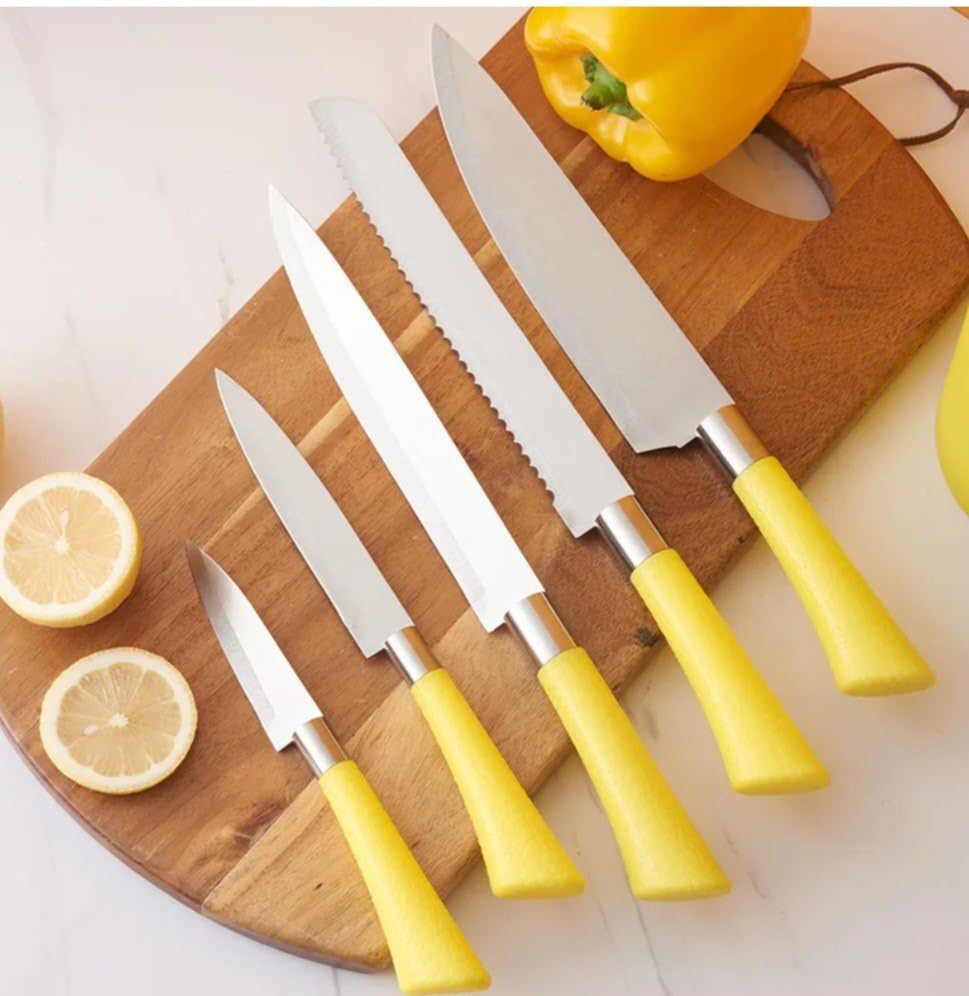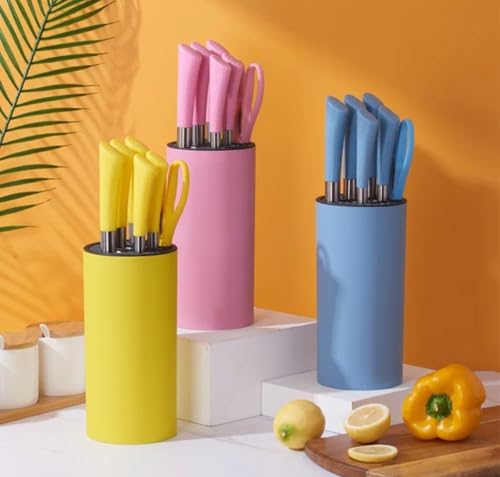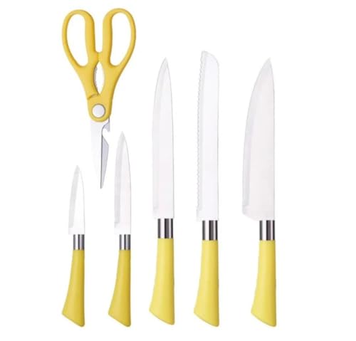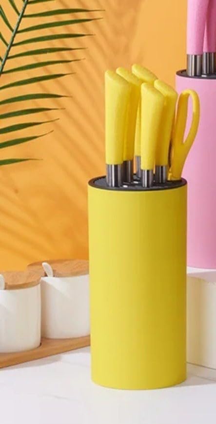 Generic - طقم سكاكين مطبخ، 7 قطع، مقابض لون وردي، تتضمن 5 سكاكين ومقص (لون أصفر)