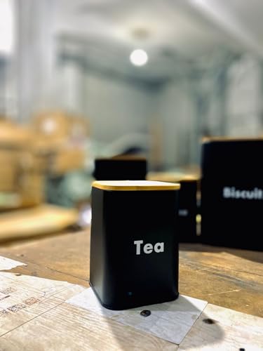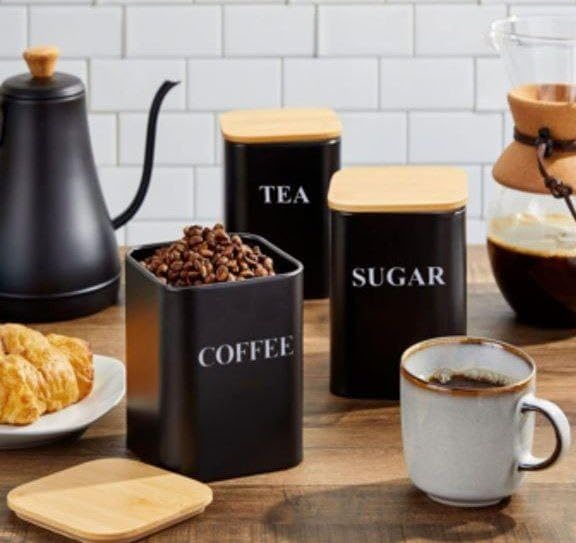 - تصميم عصري: حاويات معدنية سوداء أنيقة مع أغطية الخيزران الأنيقة تخلق مظهرًا راقيًا لطاولة المطبخ أو محطة القهوة الخاصة بك