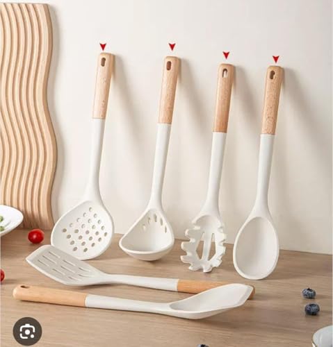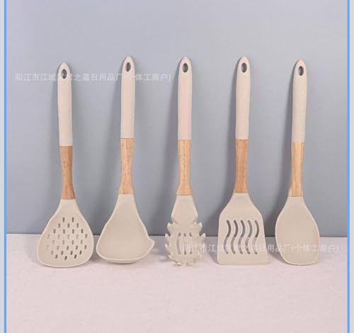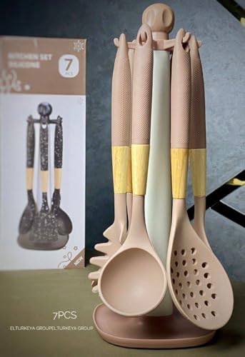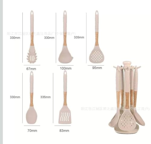 Generic - مجموعة أدوات مطبخ سيليكون مكونة من 7 قطعة من أدوات الطهي بمقابض خشب وحامل، بيج