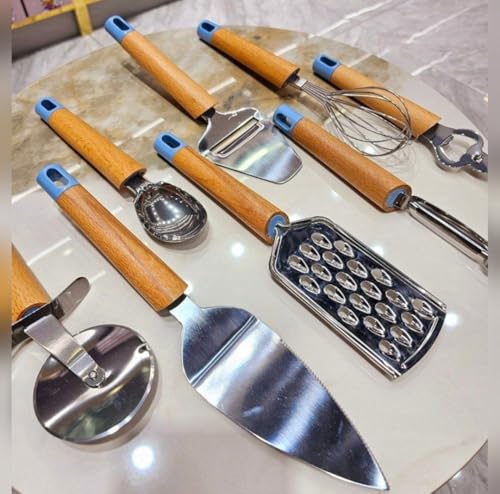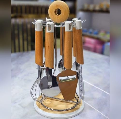Generic - طقم أواني طهي للمطبخ مع حامل من الفولاذ المقاوم للصدأ والخشب، طقم أدوات للطبخ من 8 قطع