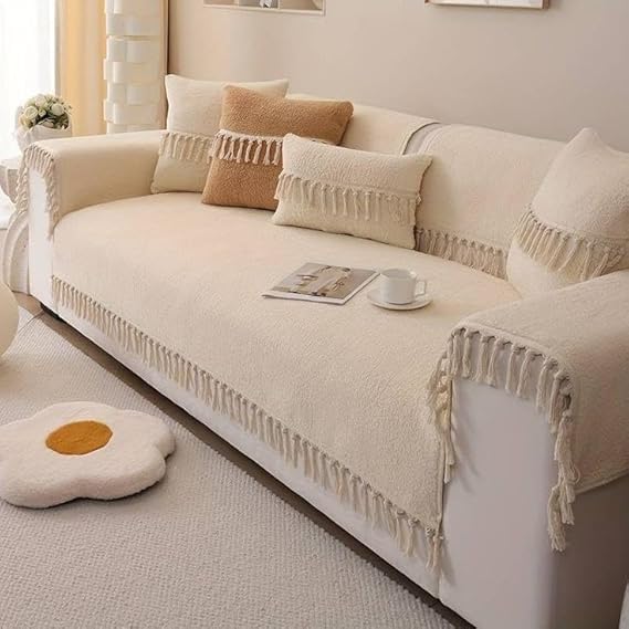 Generic - غطاء كنبة كتان بشراشيب بتصميم واقي لغرفة المعيشة، كنبة كبيرة مقاس 1.95 م × 90 سم (لون اوف وايت، طقم من 10 قطع مكون من 2 كنبة و2 كرسي)