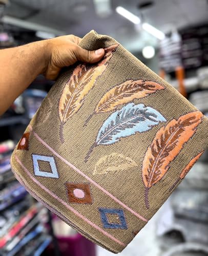 - تصميم النقشة: قماش أساسي أنيق بلون بني فاخر تتناثر عليه نقوش ريش بلون فيروزي وذهبي مع لمسات هندسية مبتكرة، ليمنحك مظهراً راقياً يجمع بين الفخامة والتميز..
