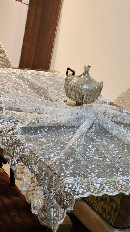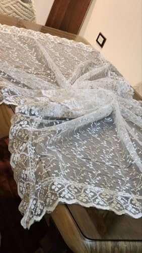 Generic - جيني مفرش طاولة بتصميم لوتس، دانتيل مطرز باللون الابيض، مقاس 130 × 225 سم، تصميم زهور انيق مع حواف سادة