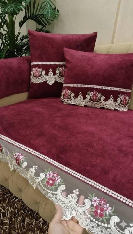 Generic - جيني طقم غرفة معيشة من قماش الشمواه الفاخر مع حواف دانتيل بنمط زهور، ابيض، مجموعة من 10 قطع، 2 كنبة، 2 كرسيين، 6 وسائد رمية.فلو (احمر)