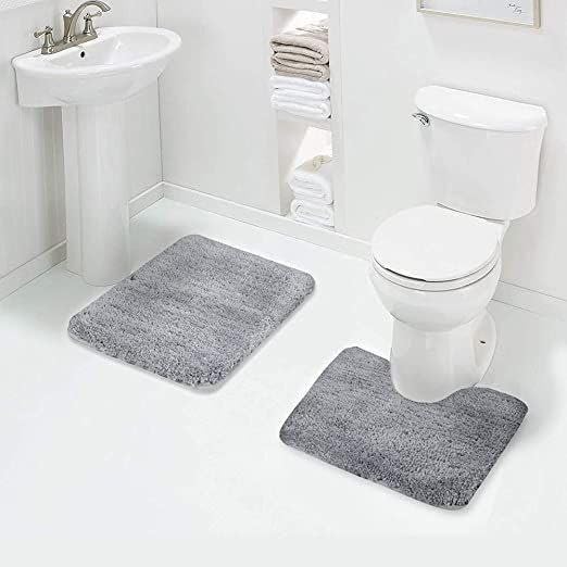 - مجموعة كاملة: مجموعة سجاد حمام فاخرة مكونة من 3 قطع باللون الرمادي الأنيق تتضمن غطاء لمقعد التواليت ودواسة باب الدش ودواسة الحوض للحصول على مظهر متناسق.
