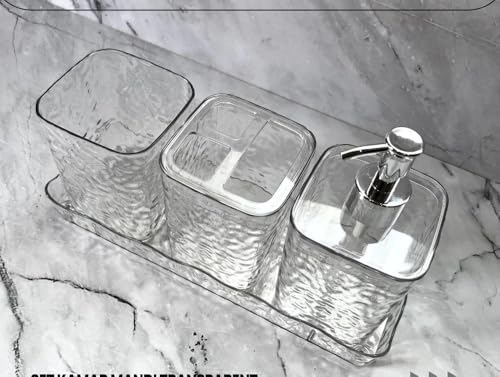 - طقم فاخر: مجموعة كاملة من ملحقات الحمام المكونة من 5 قطع بما في ذلك موزع المرطب وحامل فرشاة الأسنان ومنظم ورف وحامل صابون بتصميم اكريليك شفاف أنيق.