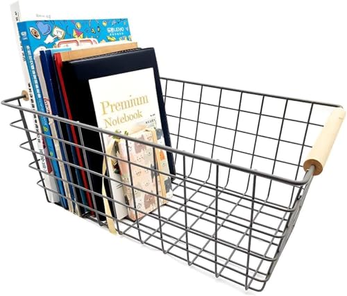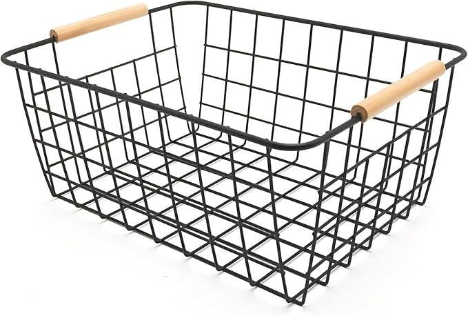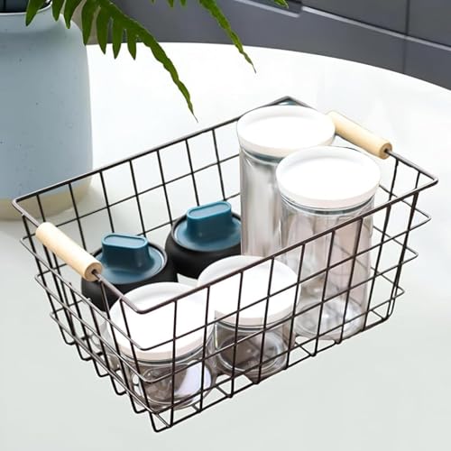 Generic - جيني سلة تخزين معدنية بمقابض خشبية، منظم اسلاك من الستانلس ستيل للمكتب، لون اسود