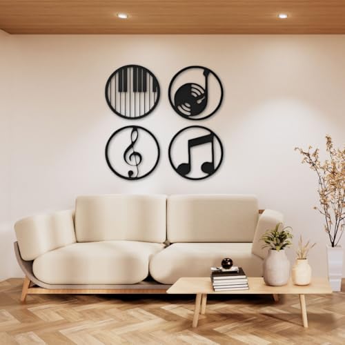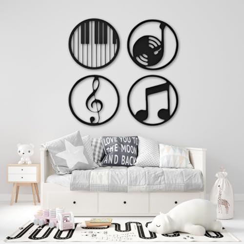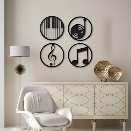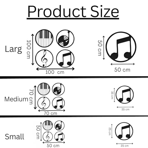Generic - جيني مجموعة ديكور فنية جدارية ذات طابع موسيقي، تصميمات دائرية معدنية سوداء مع مفاتيح بيانو ونوتات موسيقية وتسجيلات، 4 قطع مع ادوات تركيب، كبير 100 سم متوسط 70 سم صغير 50 سم (صغير)