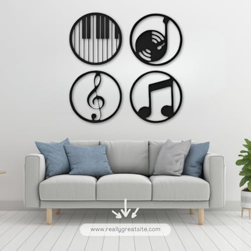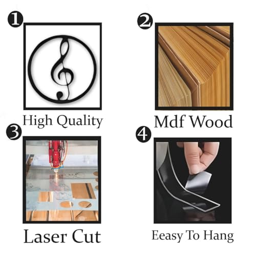 - عناصر التصميم: مجموعة من 4 قطع فنية جدارية ذات طابع موسيقي تتميز بمفاتيح بيانو وتسجيل فينيل وكلمة مرور ثلاثية وتصميمات نوتة موسيقية بلمسة نهائية سوداء أنيقة
