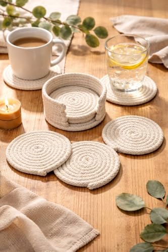 Generic - جيني مجموعة قواعد اكواب من الجوت الطبيعي مع حامل، قواعد اكواب دائرية مصنوعة يدويا، مقاومة للحرارة للمشروبات الساخنة والباردة، مجموعة من 5 قطع، .sa