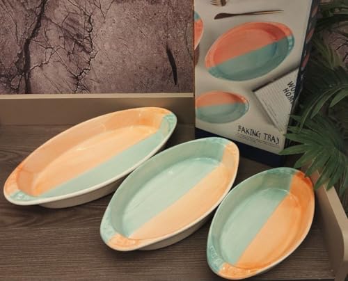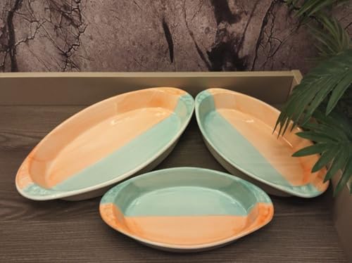 - مجموعة متعددة الاستخدامات: يحتوي على ثلاثة كسرولة بورسلين بيضاوية الشكل بمزيج أنيق من اللون الأخضر المينت والخوخي، رائع للتقديم والطهي.