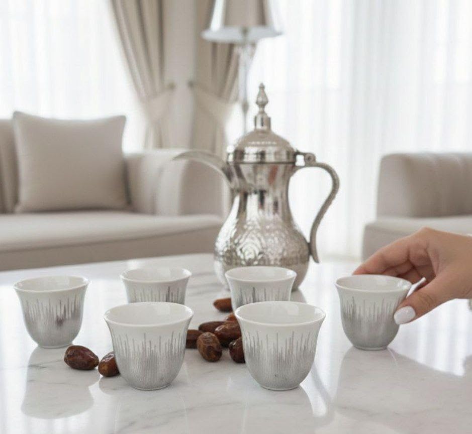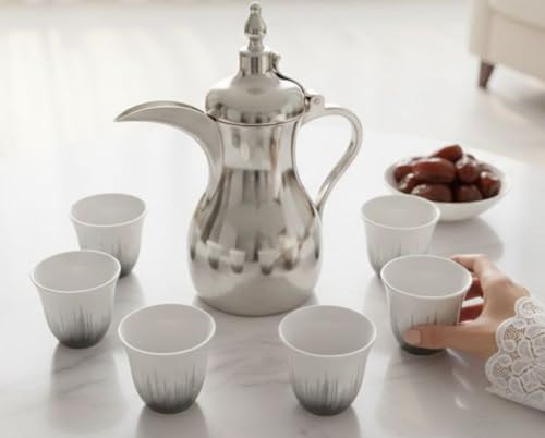 - مجموعة كاملة من 6 قطع: تشتمل على إبريق قهوة أنيق من البورسلين باللون الفضي مع غطاء و5 فناجين بورسلين متطابقة، مثالية لتقديم القهوة العربية التقليدية للعائلة والضيوف.