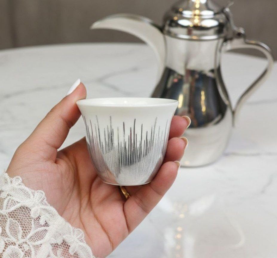 طقم فناجين قهوة عربية من البورسلين بتصميم أنيق، لون فضي، طقم من 6 قطع
