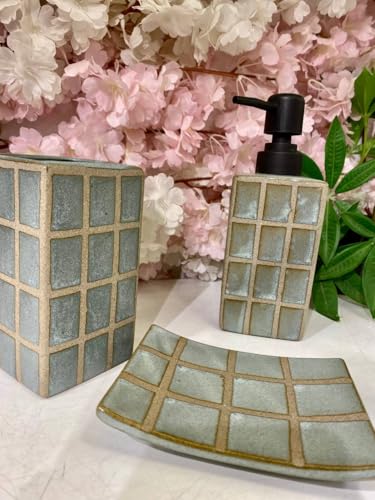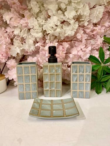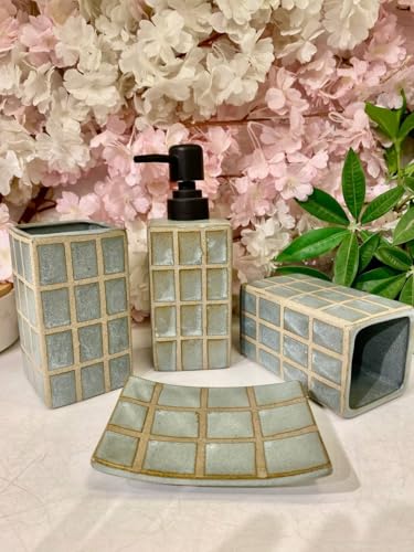Generic - جيني طقم اكسسوارات حمام من البورسلين، نمط بلاط مربع اخضر فاتح، مجموعة من 4 قطع