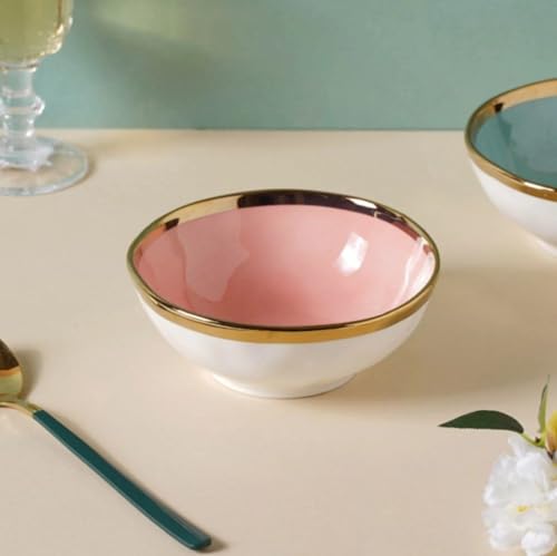 - تصميم أنيق: وعاء بورسلين متطور يتميز بحافة ذهبية فاخرة وجزء داخلي وردي ناعم وجزء خارجي أبيض نقي يضيف لمسة من الأناقة إلى أي تجربة طعام