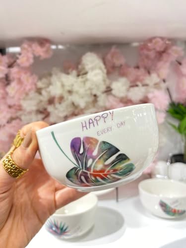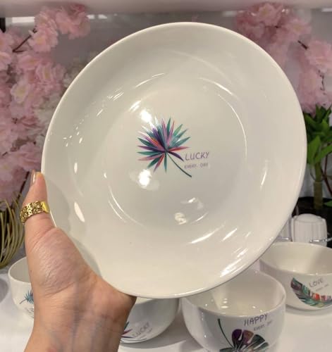 Generic - جيني طقم ادوات مائدة للافطار من البورسلين بتصميم اوراق استوائية، اوعية سيراميك بيضاء وطبق تقديم، مجموعة من 5 قطع بزخارف لاكي هابي لوف