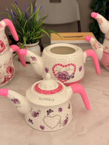 - تصميم أنيق: مجموعة غلاية شاي جميلة من البورسلين تتميز بأنماط زهور رقيقة باللونين الوردي والأبيض مع تفاصيل صدفية وزخارف وردية