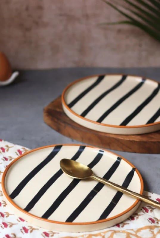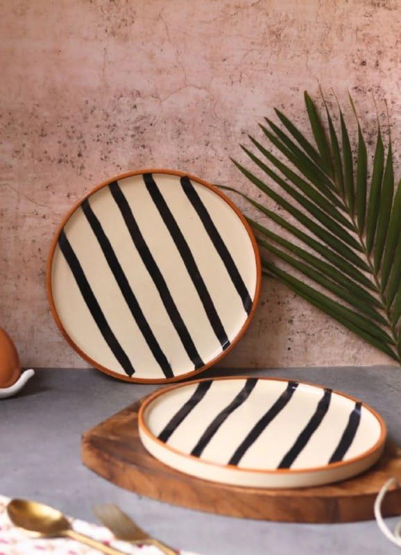 - تصميم أنيق: طبق بورسلين يتميز بنمط مخطط قطري أسود وأبيض متطور مع حافة برتقالية مميزة لإضفاء جمالية عصرية وأنيقة