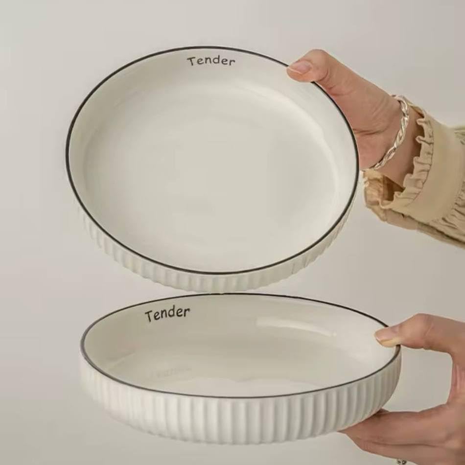 Generic - طبق تقديم بورسلين دائري 18 سم، أبيض مع حواف سوداء ونص رقيق. كيه إيه