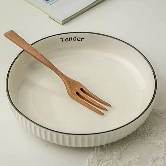 - التصميم: طبق أنيق من البورسلين الأبيض يتميّز بتصميم خارجي مضلّع وحافة سوداء، مع نقش كلمة «Tender» داخل الطبق لإضفاء لمسة راقية.