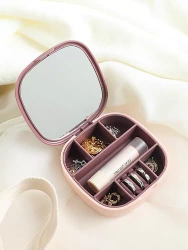 Generic - صندوق مجوهرات مع مراية بتصميم محمول للخواتم والسلاسل والحلقان وأحمر الشفاه - صندوق تخزين بمراية ونمط عصري، وردي