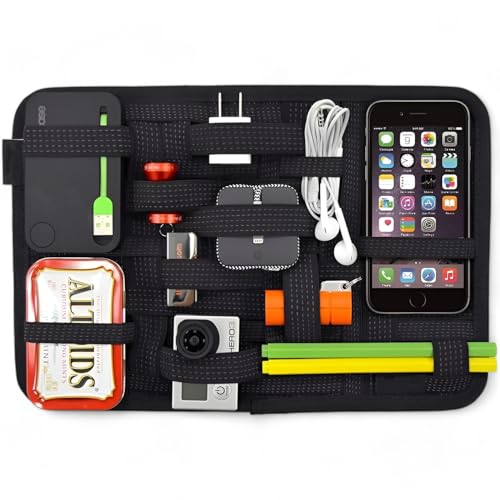 - نظام مطاطي مرن: يعتمد المنظم على شبكة من الأربطة المطاطية القوية التي يمكنها تثبيت الأدوات بأحجام مختلفة، مثل الكابلات، الشواحن، سماعات الأذن، وأدوات المكياج. هذا النظام المرن يسمح لك بتنظيم الأدوات حسب احتياجاتك الشخصية.