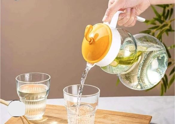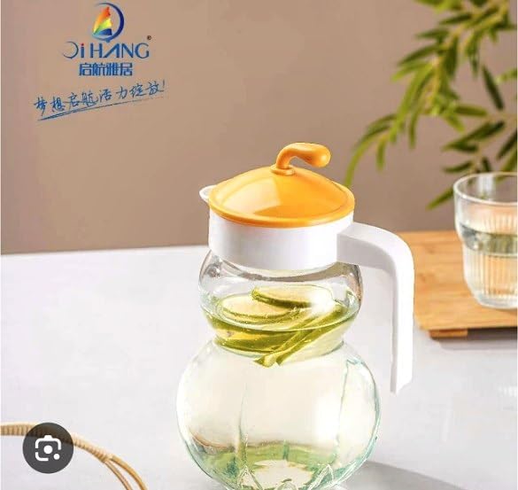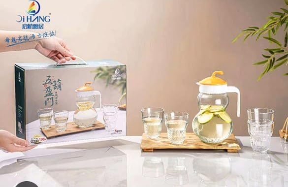 - مجموعة كاملة: شفشق زجاجي فاخر بغطاء أصفر يأتي مع 4 أكواب شرب متطابقة، مثالي لتقديم المياه والعصير والمشروبات الأخرى.