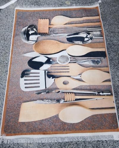 - تصميم فاخر: سجادة أرضية مطبخ مزدوجة الطبقات تتميز بنمط طباعة رقمية متطورة لأدوات المطبخ بألوان بني، مثالية لديكور المطبخ الحديث