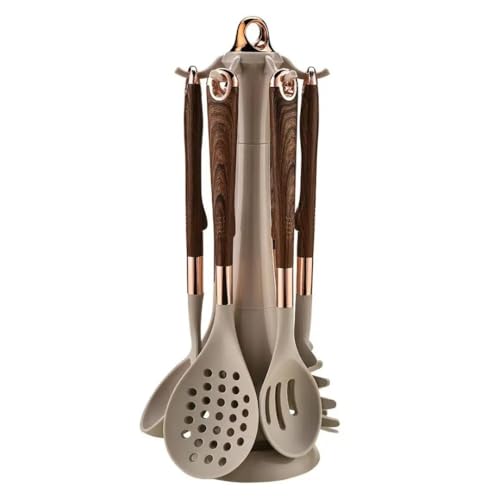 - طقم فاخر: مجموعة أدوات المطبخ المصنوعة من السيليكون مكونة من 6 قطع تتميز بمقابض خشبية أنيقة ولمسات ذهبية ورؤوس رمادية مع حامل تخزين مطابق