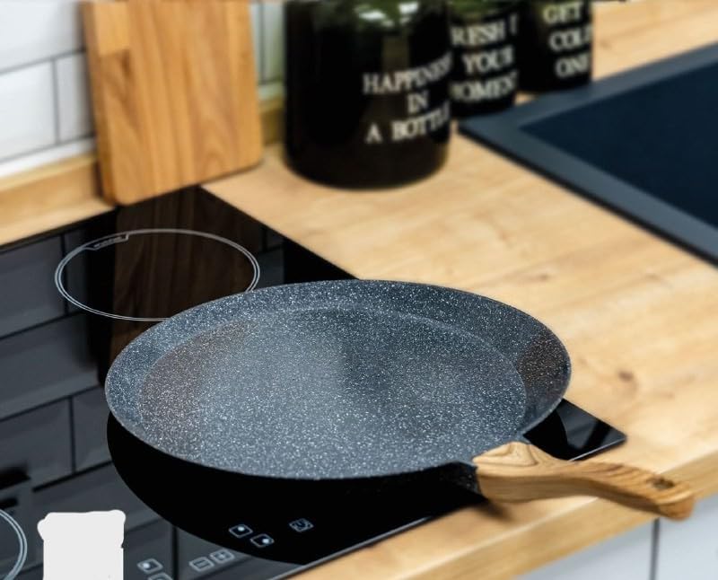 Generic - صينية كريب بتصميم حجري بسطح غير لاصق مقاس 32 سم، هيكل شديد التحمل مع مقبض خشبي للخبز والمعجنات، لون رمادي