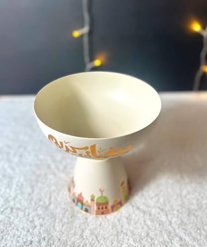 Generic - جيني وعاء زينة رمضان مع الخط العربي الذهبي، طبق بقاعدة من السيراميك الابيض بتصميم مسجد ملون. كيه ال