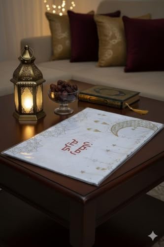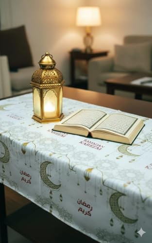 - تصميم رمضان أنيق: يتميز بقماش أبيض جميل مزين بأقمار هلال ذهبية ونجوم وخط عربي "رمضان كريم"، مما يخلق جوًا احتفاليًا وروحيًا خلال الشهر الكريم