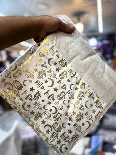 - تصميم بطابع شهر رمضان: يتميز بأنماط وزخارف أنيقة مستوحاة من رمضان باللونين الذهبي والأبيض، مصنوعة بشكل جميل مع تفاصيل مكرمية لخلق جو احتفالي خلال الشهر الكريم.