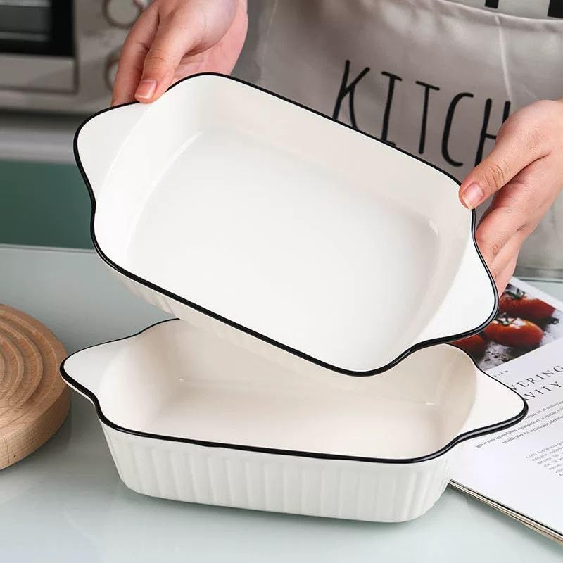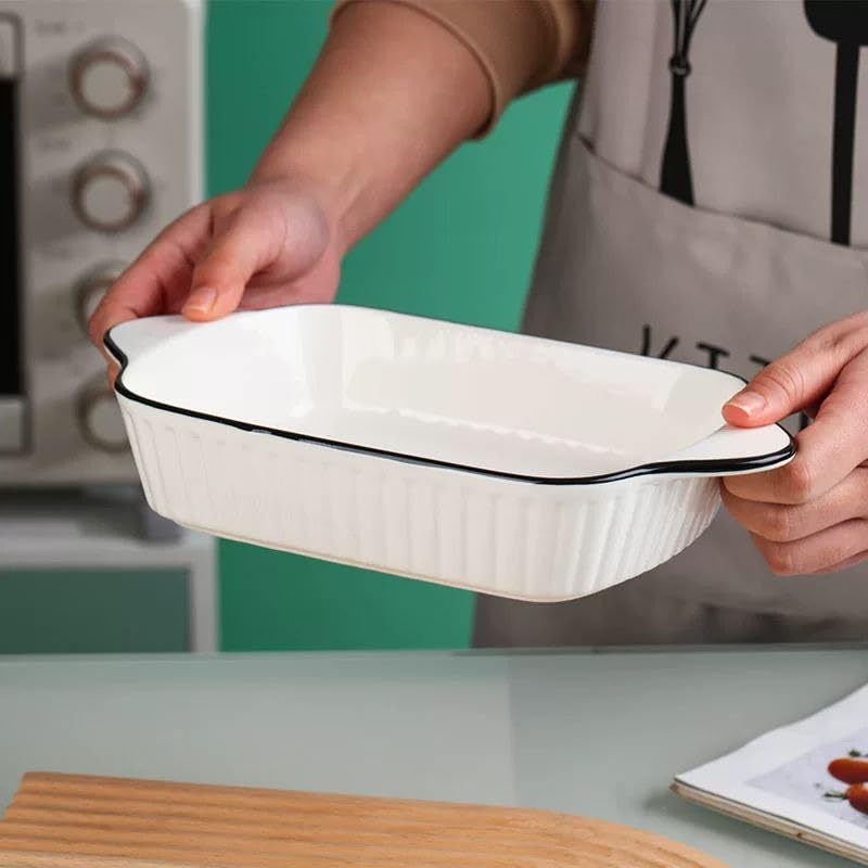 - مزايا التصميم: طبق خبز سيراميك مستطيل أنيق مع نمط كلاسيكي مخطط خارجي ومقابض مزدوجة مريحة لقبضة آمنة وسهولة الحمل