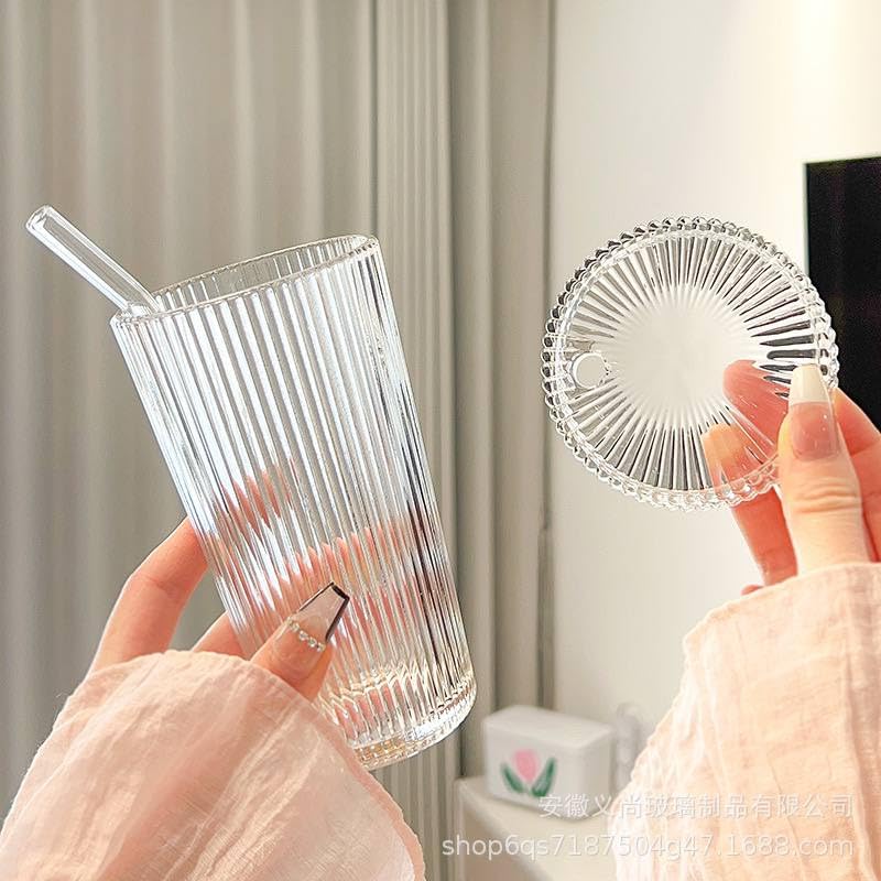 Generic - كوب زجاجي كريستالي مضلع مع شفاطة وغطاء بتصميم قاعدة أكواب، كوب قهوة مثلج اي ار