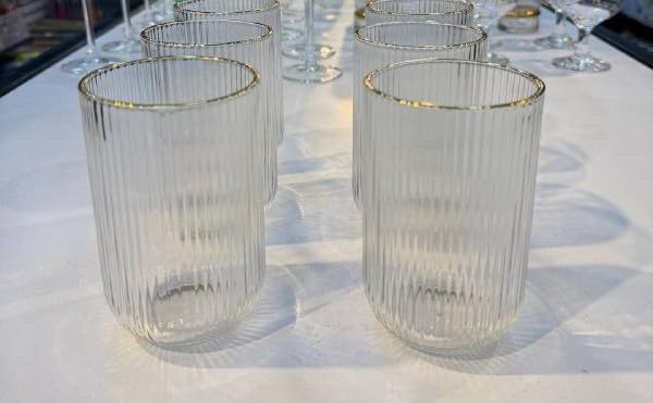 - تصميم أنيق: مجموعة من 6 أكواب زجاجية مضلعة شفافة تتميز بحافة متطورة مطلية بالذهب تضيف لمسة من الفخامة إلى أي طاولة