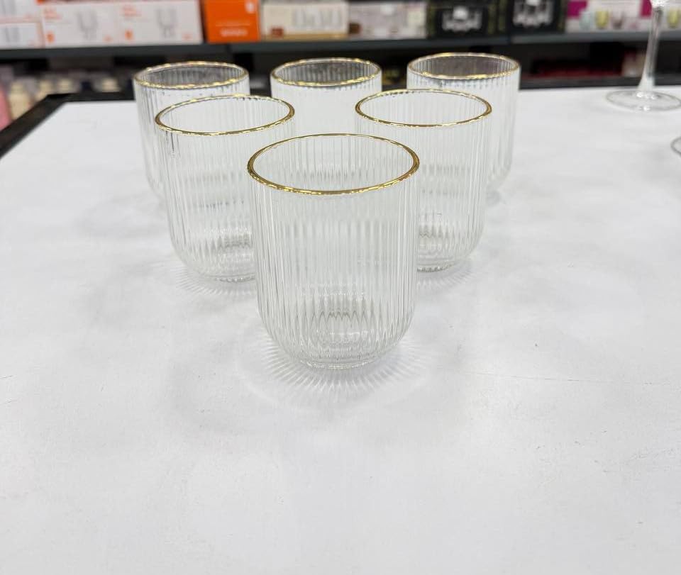 - تصميم متطور: يتميز كل زجاج شفاف بملمس مضلع رأسي جميل يلتقط الضوء، ويكمله لمسة حافة ذهبية فاخرة لمظهر راقي