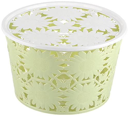 elyassin - سلة بلاستيكية دائرية بتصميم على شكل ورد وغطاء - زيتي ابيض