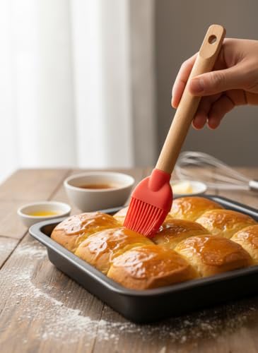 - رأس سيليكون مرن: شعيرات ناعمة ومرنة تسمح بوضع الزيوت والزبدة وغسول البيض والصلصات دون خدش أواني الطهي أو أسطح الخبز
