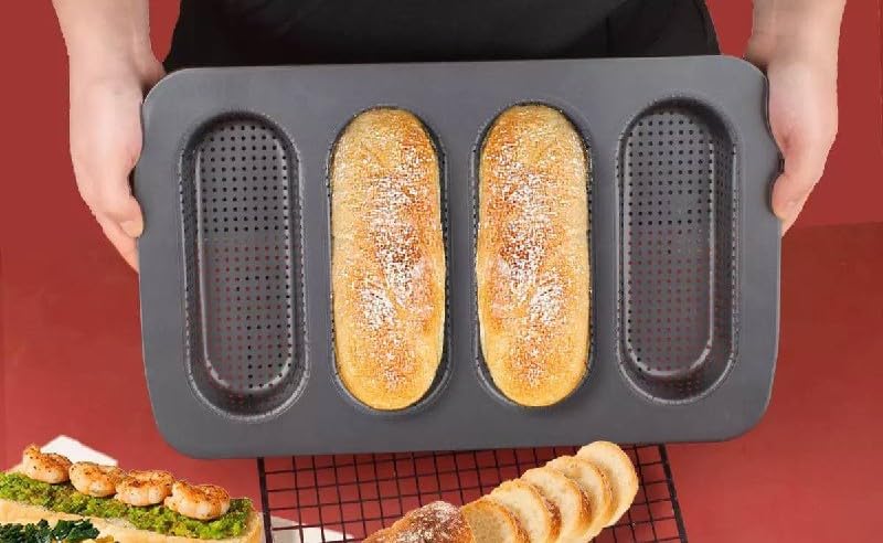 - تصميم بـ 4 تجاويف: تتميز بأربعة قوالب ممدودة مثالية لصنع خبز باجيت موحد أو كعك هوت دوج أو لفائف الخبز الفرنسي مع نتائج ذات مظهر احترافي في كل مرة.