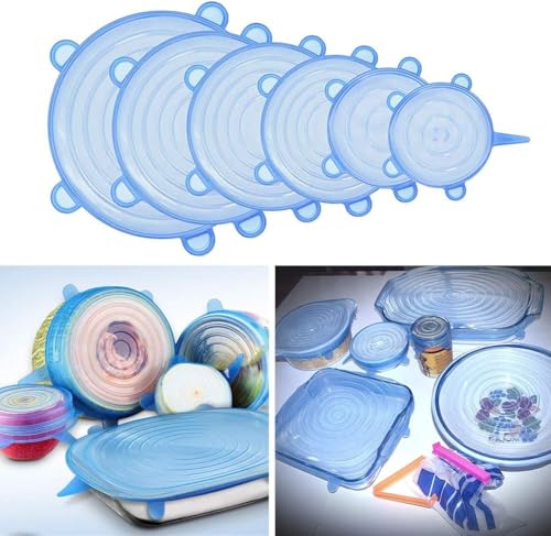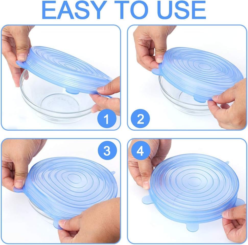 - هناك 6 مقاسات مختلفة من أغطية السيليكون بأقطار 6.5 سم، 9.5 سم، 11.5 سم، 14.5 سم، 16.5 سم، 20.5 سم، والتي يمكن أن تشكل إغلاقًا مثاليًا على أي حاوية بلاستيكية أو معدنية. كما يمكن استبدال غطاء الحاوية الدائري المفقود.