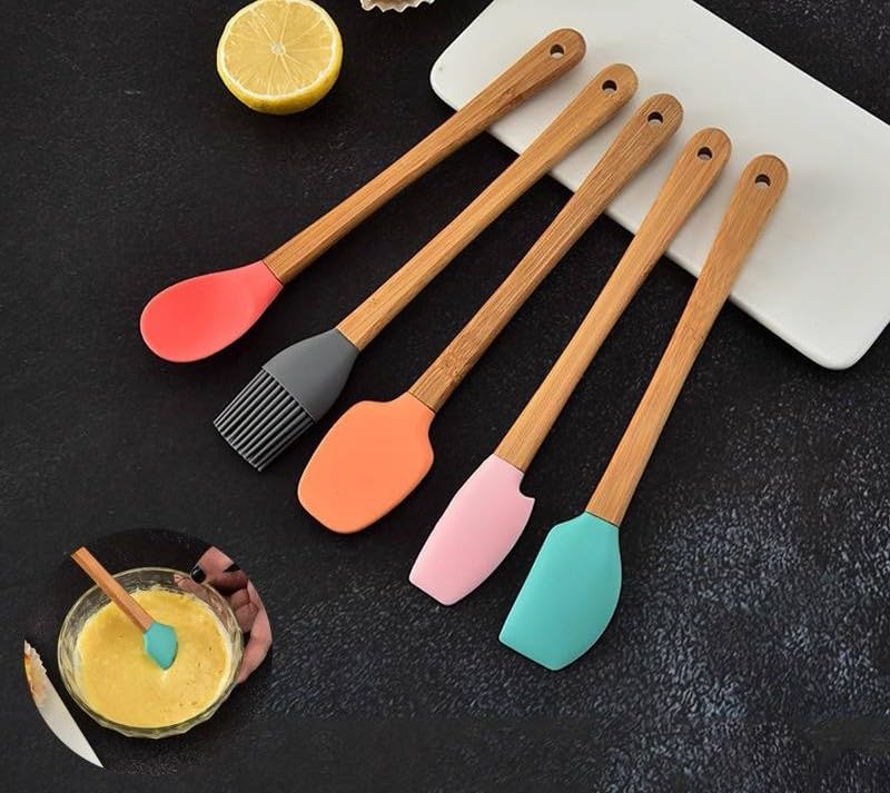 Generic - جيني طقم ملاعق سباتولا سيليكون بمقبض خشبي، مجموعة ادوات مطبخ من 5 قطع، تتضمن فرشاة وملعقة سباتولا، متعددة الالوان، .بي
