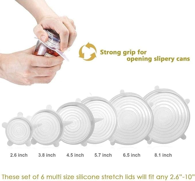 - أغطية السيليكون المرِنة الخاصة بنا مثالية لإحكام إغلاق مجموعة متنوعة من الأوعية، بما في ذلك: الأطباق العميقة والأكواب، والحلل والعلب وبرطمانات الماسون وغيرها. يوفر الإغلاق المحكم حماية تحافظ على الطعام طازجًا وتمنع الانسكاب.