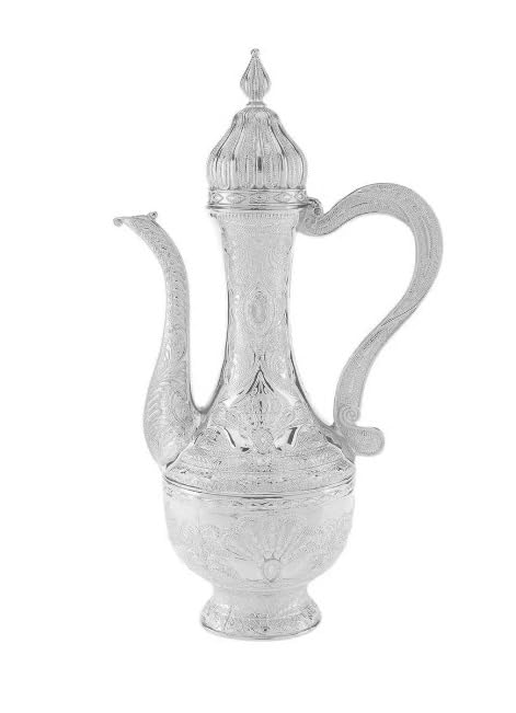 - تصميم أنيق: مجموعة تقديم الشاي / القهوة المزخرفة المطلية بالفضة تتميز بإبريق مفصل بشكل معقد مع أنماط زخرفية وصينية تقديم مطابقة