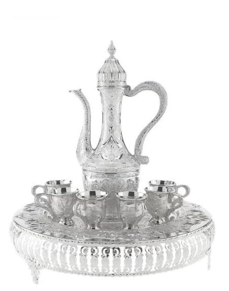 - الحرفية: تعرض الأعمال المعدنية المفصلة بدقة أنماطًا وتصميمات معقدة في جميع أنحاء الإبريق والأكواب وصينية التقديم