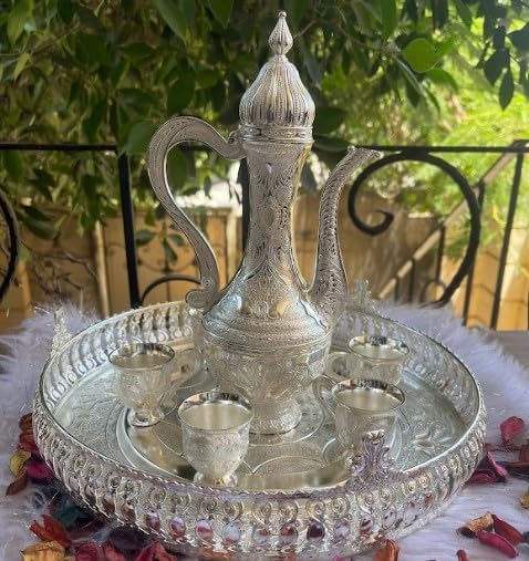 Generic - جيني طقم شاي فضي مزخرف مع ابريق مزخرف وصينية تقديم، نمط شرق أوسط تقليدي