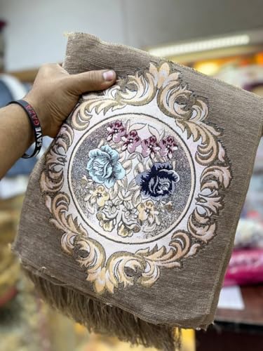 - تصميم زهور أنيق: يتميز بنمط زهور مطرز جميل بدرجات متعددة الألوان من الأزرق والأرجواني والذهبي على خلفية بنية مع حواف مزخرفة بنمط الباروك لمظهر فاخر