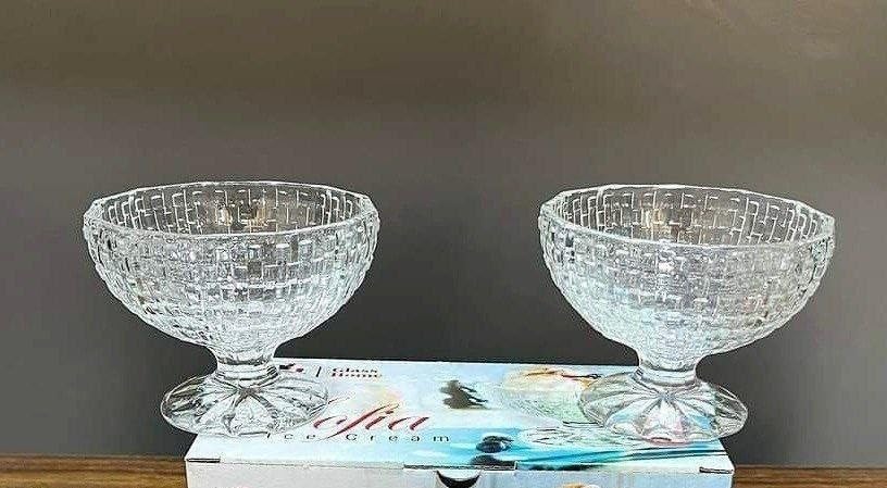 - محتويات المجموعة: تتضمن العبوة وعاءين زجاجيين متطابقين على الطراز الكريستالي، بحجم مثالي للآيس كريم أو الحلويات أو العروض الزخرفية